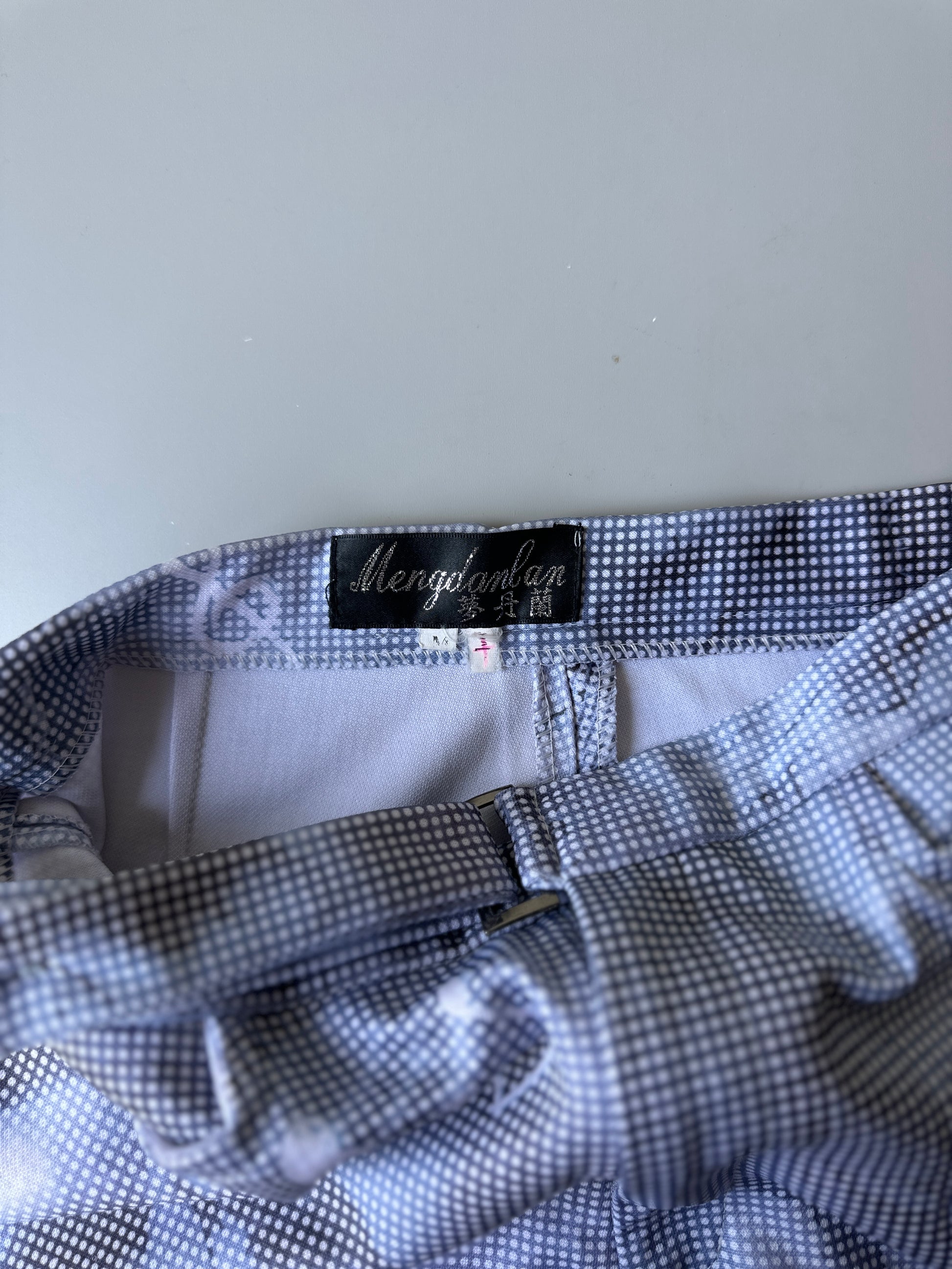 description. these are the COOLEST pair of y2k pants I've ever found. the print is iconic, up close its just heaps of dots on a blue background with some bass and treble clef icons, but from afar you can see the faces underneath the pattern. great for the club, or a casual trip to the coffee shop depending on your style. these babies need to find their owner