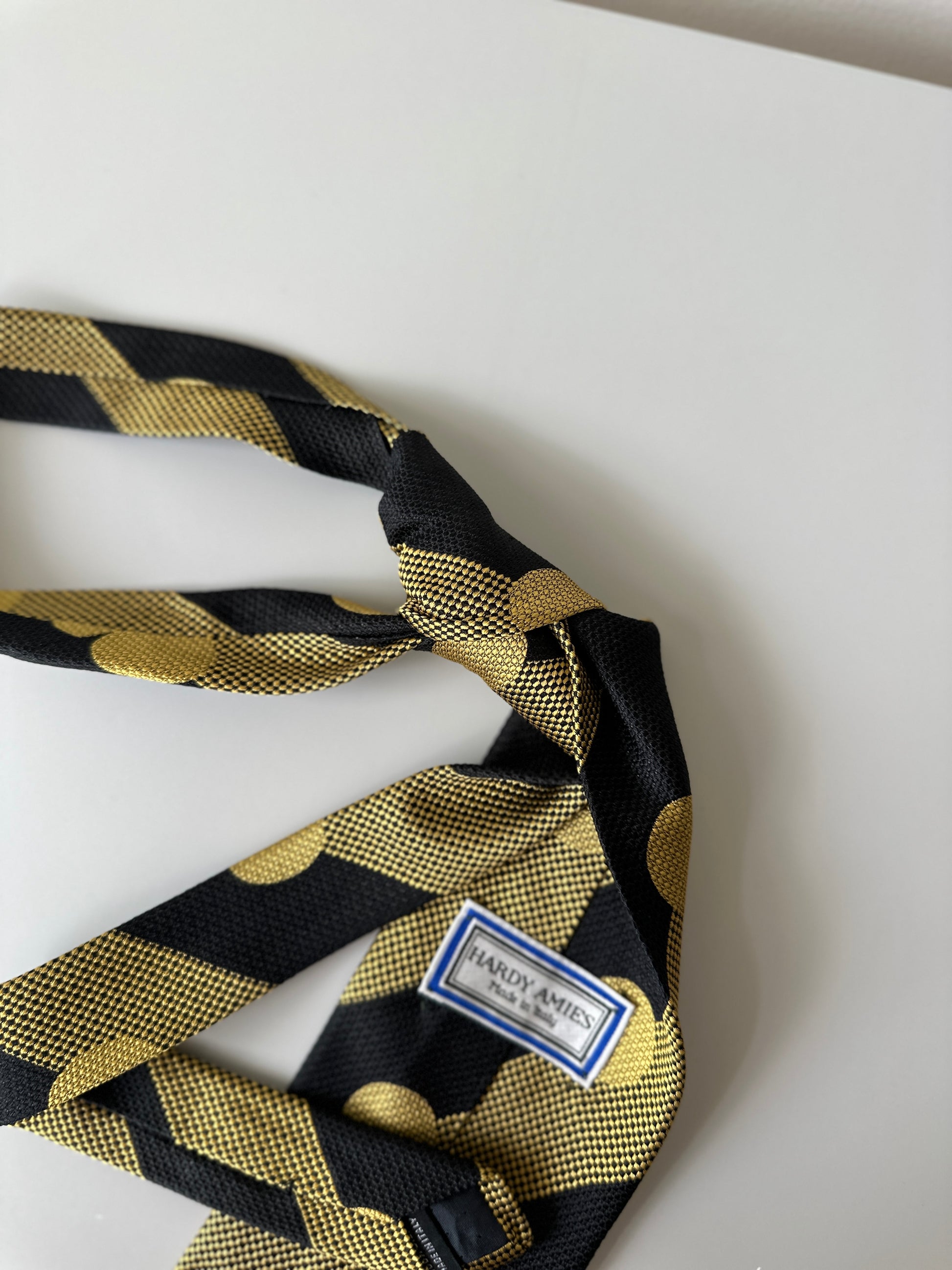 description. THE coolest yellow and black polka dot tie with diagonal stripes. made in Italy, the material is quick thick and textured