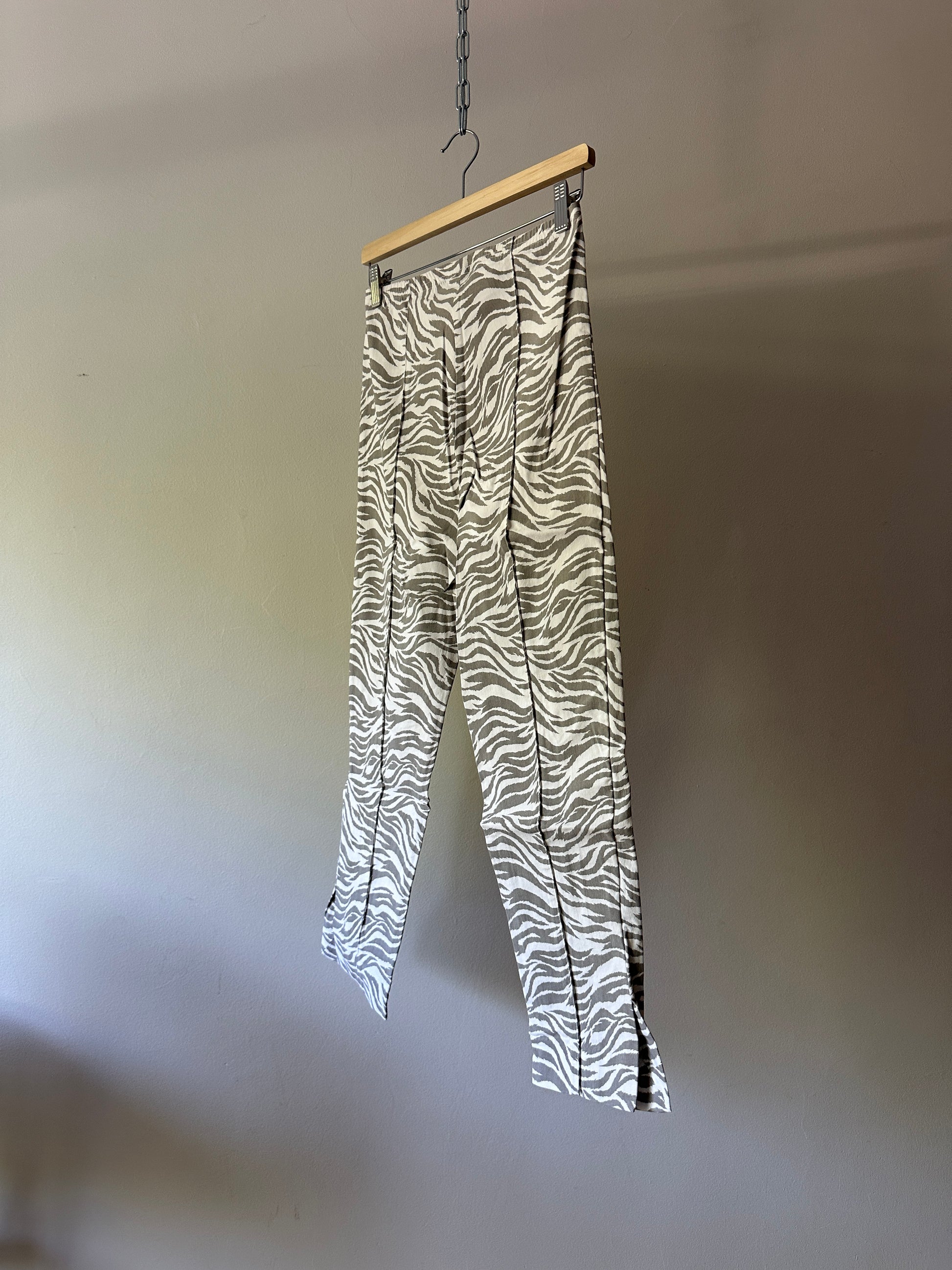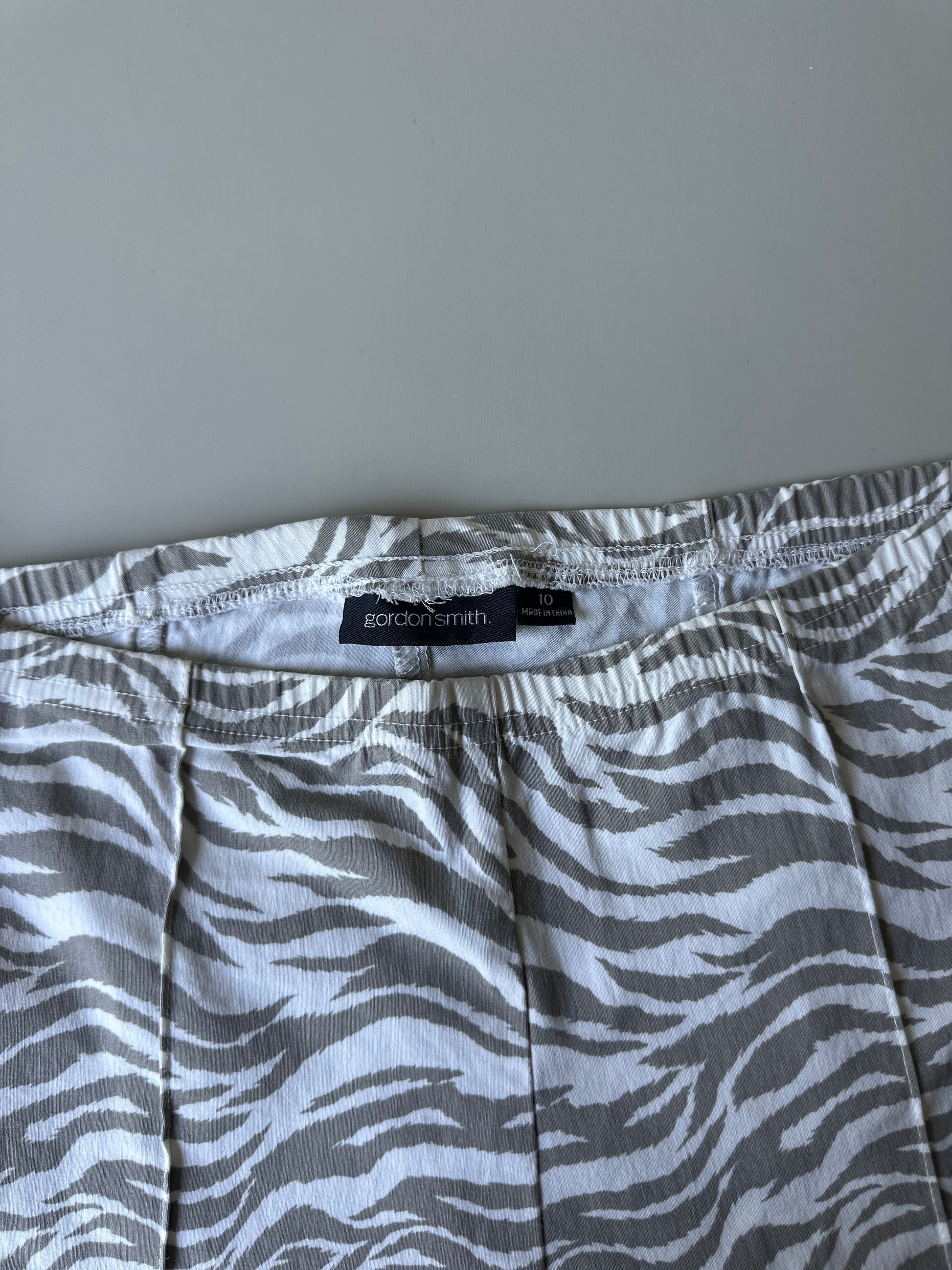 description. the funkiest pair zebra print capri's in a grey and white colour way, high waisted, super stretchy and a little slit in the hem of each leg.
